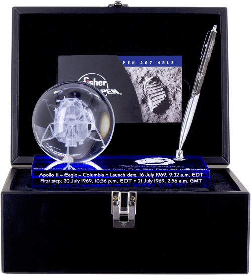 Pen Engraving: Commemorative Moon Landing diamond cut to chrome plating Box: Lacquered Baltic birch handcrafted in USA