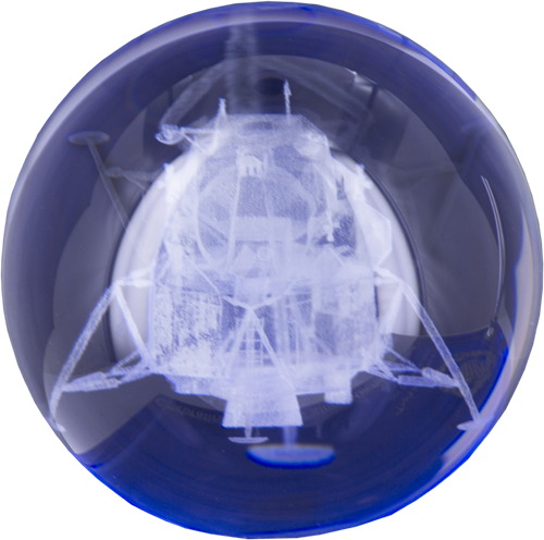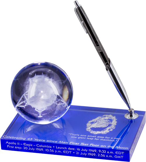 Lunar Crystal Pen Holder: Blue crystal base with Lunar Module engraved in clear crystal globe