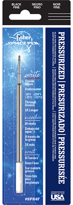 Fisher Space Pen’s Sealed Pressurized Ink Cartridge performs in temperatures from -30º F to +250º F, underwater, in zero gravity, at any angle–even upside down! The ultimate in dependability!