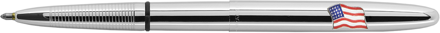The original Bullet Space Pen was conceived in July of 1948. Paul Fisher was soon machining a new pen design shaped from solid aluminum. It became our first Fisher ball point pen, the 400 Bullet Pen, and arguably the most popular pen of the twentieth century. This pen is now all brass with a chrome finish with an American Flag Emblem.