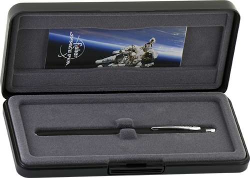 Shuttle Pens are packaged in a heavy-duty gift box with flock lining and each includes a guarantee and re-order pamphlet with a brief description of the history of Fisher Space Pen Co.