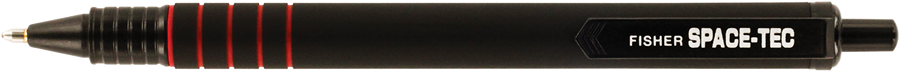 The Fisher Space-Tec is an affordable, retractable click pen. The length of the barrel has a black PVC coating with a feeling similar to rubber. It features a thick plastic clip, and the red grip lines are cut to a substantial depth to ensure that your fingers will never slip!